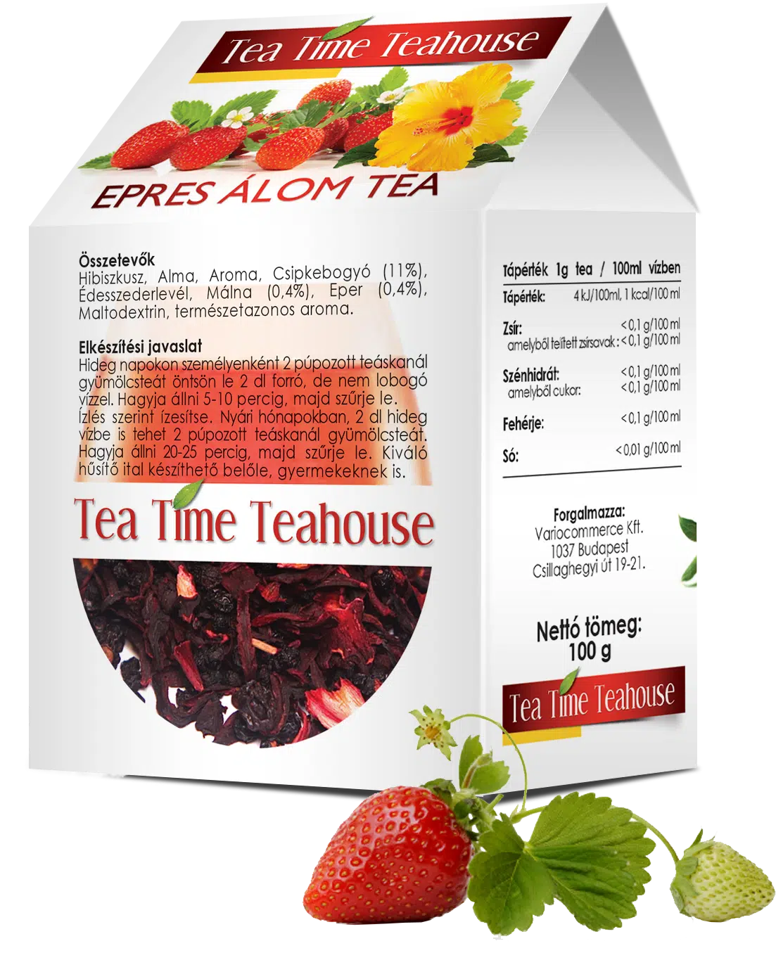 Hibiszkusz, alma, illat, cserkebogy (11%), édes szederlevél, málna (0,4%), eper (0,4%), maltodekstrin, természetes illat.